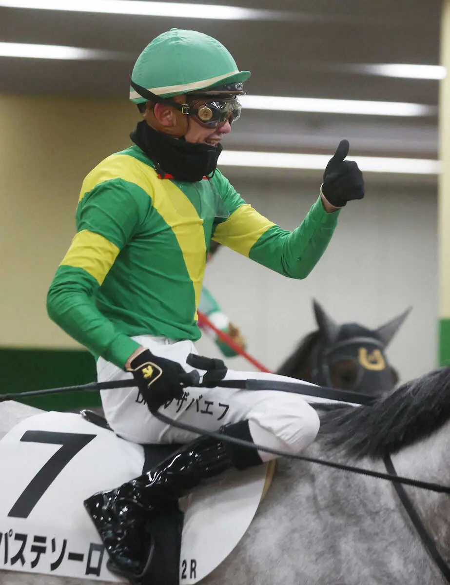 <中京2R>ルーパステソーロに騎乗し、JRA初勝利を挙げサムアップポーズで喜ぶムルザバエフ(撮影・椎名 航)
