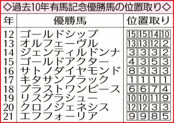 《4角3番手以内理想》有馬記念は位置取りが肝心。過去10年、4角6番手以下から差し切った馬は12年ゴールドシップ、19年リスグラシューの2頭しかいない。6頭と過半数が4角3番手以内からVをつかんでいる。マーカンドが自信を持つ、ポジションキープ力がVを呼ぶか。