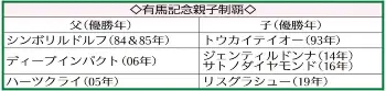 《父子制覇は過去4回》有馬記念の親子制覇は過去に4回あった。84&85年に連覇したシンボリルドルフの子トウカイテイオーが93年に勝ち、06年覇者ディープインパクトの産駒は14年ジェンティルドンナ、16年サトノダイヤモンドの2頭がV。05年にディープを負かしたハーツクライの娘リスグラシューも19年に制した。これらは全て父子制覇。ジェンティルドンナの娘ジェラルディーナが勝てば、史上初の母子制覇となり、母の父ディープから続く3代制覇となる。また父子制覇が懸かるディープ産駒のジャスティンパレス&ポタジェのほか、12年覇者ゴールドシップの産駒ウインマイティー、17年優勝キタサンブラックの産駒イクイノックスにも注目だ。