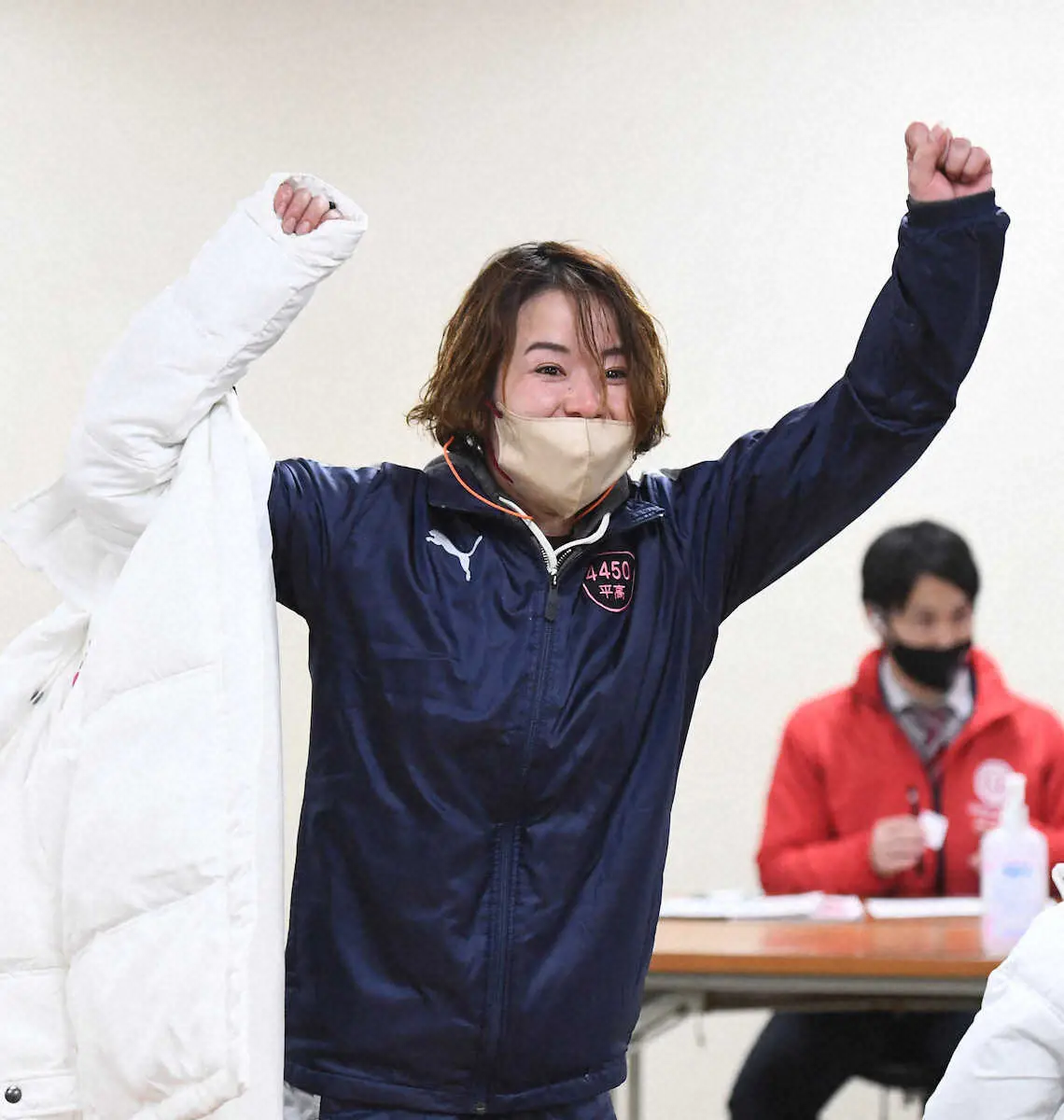 枠番抽選で1号艇を引き当てガッツポーズを決める平高