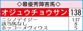 最優秀障害馬は昨年いっぱいで現役を引退したオジュウチョウサン。16~18、21年に続き5度目の受賞。得票138票は、暮れの中山大障害を制したニシノデイジーと1票差。JRAに記録が残る04年以降、最少得票差での選出となった。