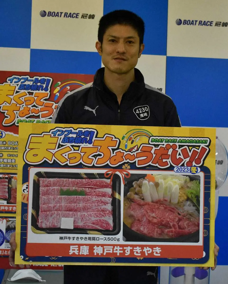 3日目は、11Rで浜崎直矢(39)が3コースから強烈なツケマイを決めて“捲り賞”を獲得。ガラポン抽選で「神戸牛すき焼き」をゲットした。今節5本目の捲り賞だが「捲るつもりはなかった。捲り差しに入れなかったので」とレースを振り返った。「家族全員で食べられるので良かったです」と笑顔をみせた。
