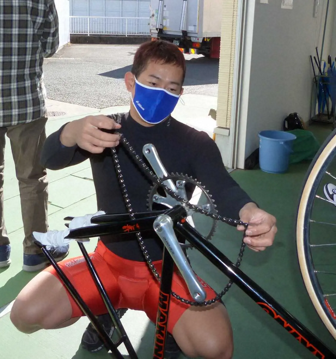 <2>浅井康太 練習中の落車で左の肩鎖関節を痛めた。山口君へ。