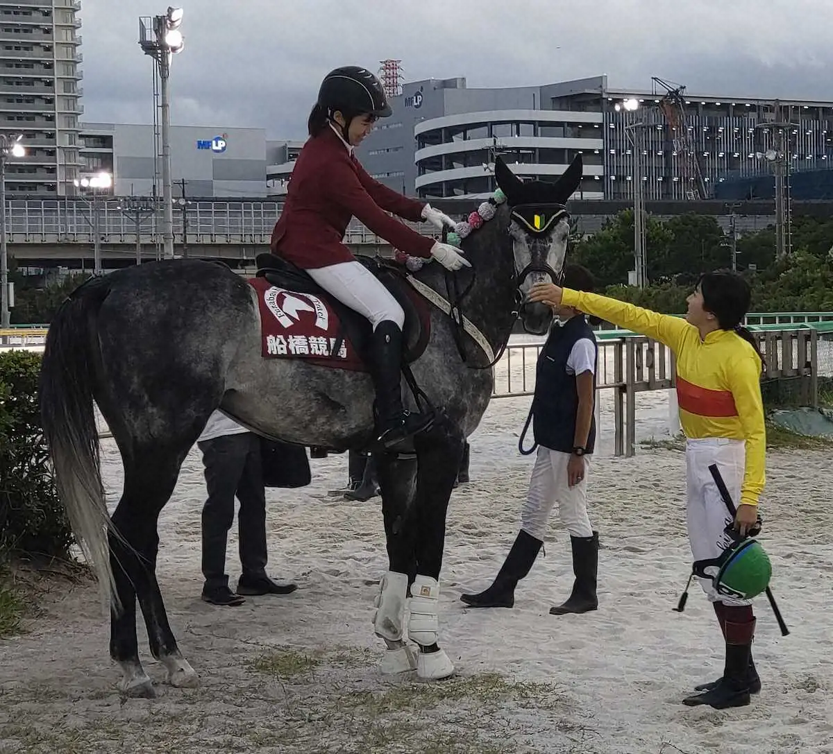21日は11R、1レースのみ。先輩のタカラスノーウェーヴとともに後続を引き連れ馬場入り。スタンド正面ではファンの撮影にも応えてから、引き揚げて無事初仕事を終えた。仕事前には船橋初騎乗となった今村聖奈と初対面。「触らせてもらったが、初日でも堂々としていた。さすが活躍した馬」とお褒めの言葉をもらっていた。