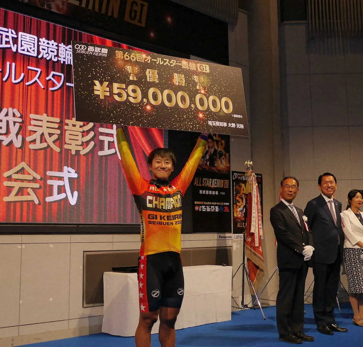 「第66回オールスター競輪」の決勝戦は20日、西武園競輪場で行われ、吉田拓矢の逃げに乗った真杉匠(24=栃木・113期)が番手から捲って優勝。賞金5900万円(副賞含む)と「グランプリ2023」(12月30日=立川)の出場権利を獲得した。真杉のグランプリ出場は初。なお2着は古性優作、3着は武藤龍生の決着だった。