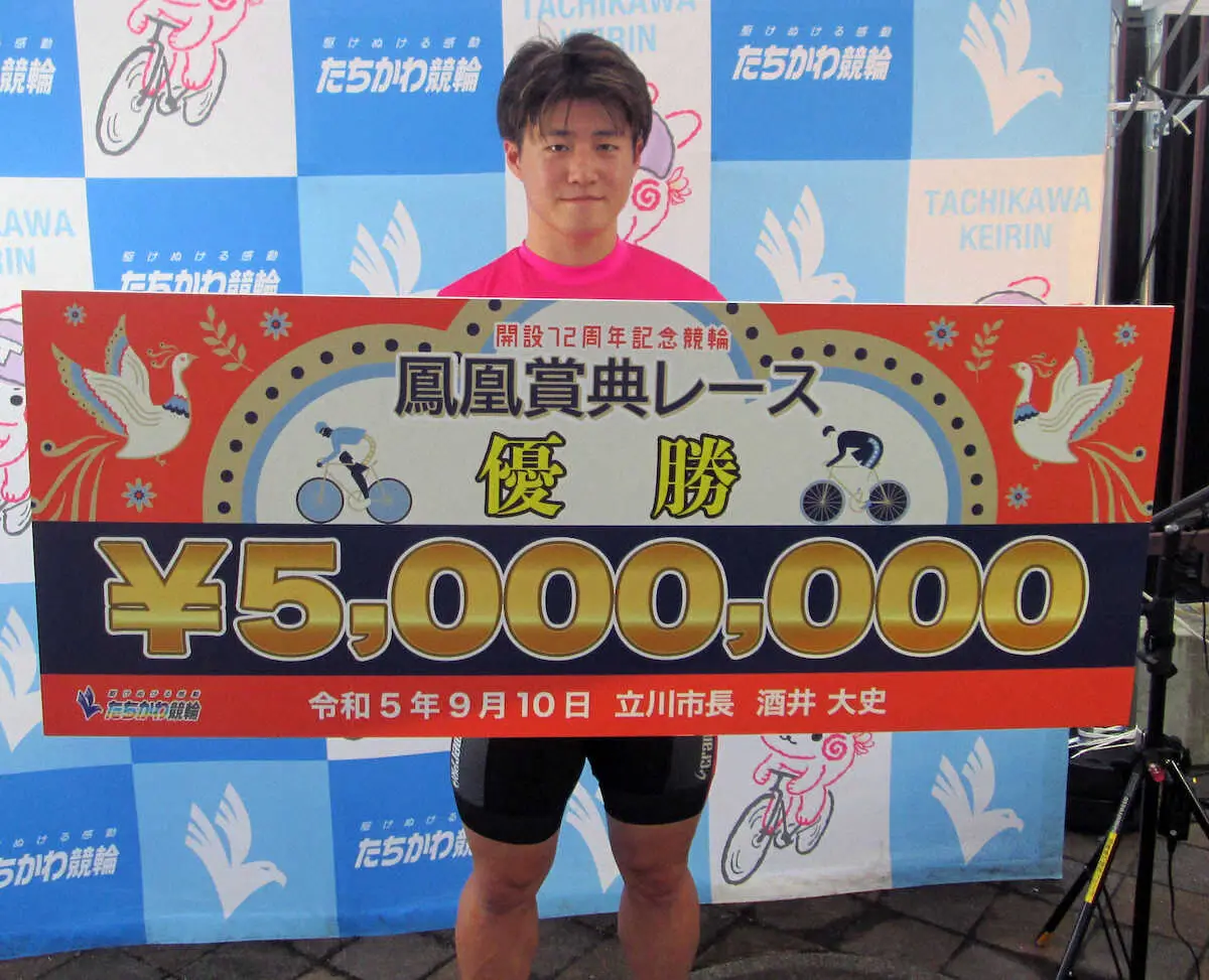 立川競輪の開設72周年記念「G3鳳凰賞典レース」は10日、12Rで決勝戦が行われ、真杉匠の番手から捲った森田優弥(25=埼玉・113期)が1着。記念初優勝を飾った。2着に佐々木悠葵、3着は平原康多が入り、関東ワンツースリーで決着した。