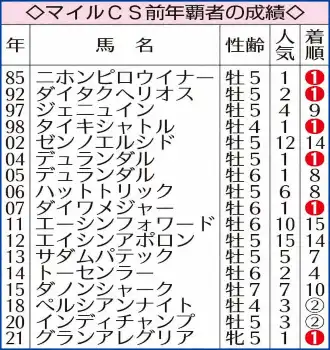 ≪JRA初の同一G1父子2代連覇に挑む≫マイルCSの前年勝ち馬は別表のように過去17頭が出走し、85年ニホンピロウイナーから21年グランアレグリアまで6頭が連覇を成し遂げた。その中にセリフォスの父で06&07年Vダイワメジャーも含まれている。2年ぶり7頭目の連覇なら史上初のJRA同一G1父子2代連覇だ。