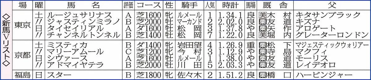 京都では日曜芝1600メートルを勝ち上がったシヴァースのレースセンスが光った。母ヴィブロスは16年秋華賞、翌年ドバイターフを制した実績馬。直線で前が窮屈になりそうなシーンにも冷静に対応。進路をインコースに切り替え、接戦を制した。ムーアの負傷で乗り替わったルメールは「2歳馬に見えなかった。いいスタートで乗りやすい」と操縦性の高さを評価した。