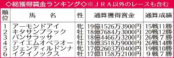 《勝てば総獲得賞金歴代1位に》ジャパンCの1着賞金は5億円で、これが有馬記念と並び国内最高額。現在、総獲得賞金歴代6位のイクイノックス(17億1158万2100円)が勝てば、史上初めて20億円の大台を突破し、歴代1位に躍り出る。同馬はドバイシーマクラシックを勝ち、JC褒賞金の対象となっており、Vなら1着賞金とは別に200万ドル(約3億円)のボーナスもゲットする。また、海外で15億円以上を荒稼ぎして歴代3位のパンサラッサ(18億4466万3200円)も勝てば1位となる。