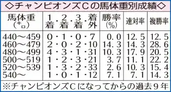 (4)馬体重 スピードとパワー、両方が必要とされるレース。馬体重にも大きな傾向が見られる。499キロ以下【6・4・3・48】に比べて、500キロ以上は【3・5・6・66】と成績が良くない。パワーだけでなく、切れ味もいるためだ。今回人気必至のレモンポップ(前走517キロ)、セラフィックコール(同536キロ)、メイショウハリオ(前走503キロ)にとって不吉なデータと言える。
