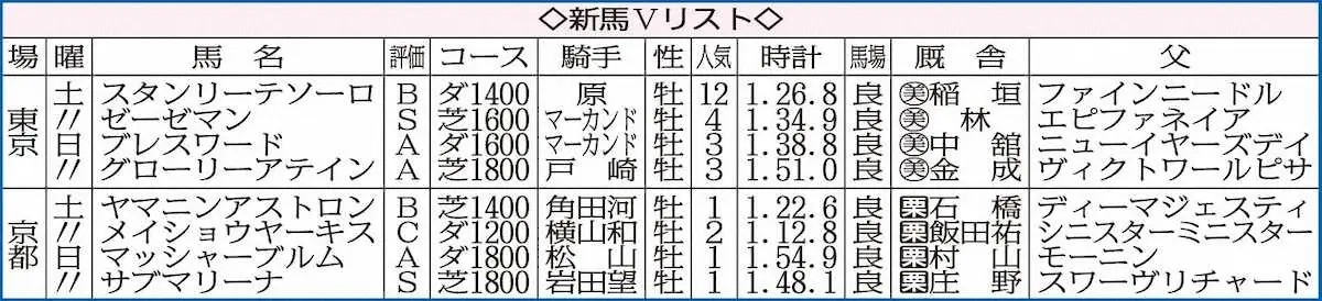 2場で8鞍が行われた。東京では土曜芝1600メートルのゼーゼマンが一級品の切れを披露した。出遅れ気味のスタートから、道中は中団の内で待機。直線で大外に出されると、上がり3F33秒3の脚で他馬を一蹴した。林師は「マイルとはいえ、しっかり折り合えたのは大きい」と内容に手応えを感じており、距離が延びても問題なさそう。近親に1600~2400メートルでG1・6勝ブエナビスタがいる良血。クラシックをにぎわせる存在になりそうだ。