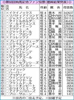 JRAは7日、第68回有馬記念(24日、中山)のファン投票最終結果を発表。これがラストランとなるタイトルホルダー(牡5=栗田)は24万6436票を集め、4位に支持された。最多得票のイクイノックスがすでに引退を発表しているため、出走予定の関東馬ではトップ。