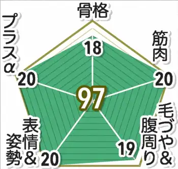 有馬記念の馬体診断では5つの項目別に採点。スルーセブンシーズの劇的な変化は特別な押し材料を加点する「プラスα」20点満点です。「筋肉」も満点。量より質の弾力性に富んだ筋肉も父系伝来です。「表情&姿勢」も闘志満々のステイづらだけに満点。「毛ヅヤ&腹周り」は採点しづらい。上半身を欧州馬のようにクリッピング(毛刈り)しているからです。冬は被毛が長くなって乾きづらい。内臓を冷やさないように刈っておくのです。クリッピングしていない前腕とスネの下に冬毛が見えるため1点減点しましたが、牝馬は冬毛が伸びやすいので問題ありません。