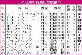 ◇池添 謙一(いけぞえ・けんいち)1979年(昭54)7月23日生まれ、滋賀県出身の44歳。98年に栗東・鶴留明雄厩舎所属で騎手デビュー、同年北九州記念(トウショウオリオン)で重賞初騎乗V。11年にオルフェーヴルでクラシック3冠制覇。父・兼雄氏は元調教師、弟・学師は現役調教師。JRA通算1万4636戦1363勝、うちG127勝を含む重賞96勝。1メートル62、50キロ。血液型O。