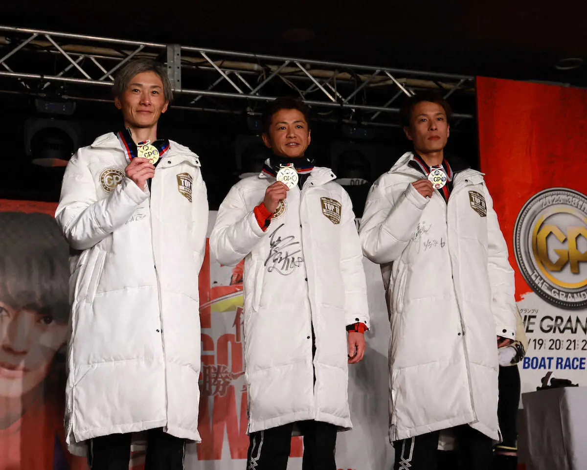 優勝した石野貴之(中央)、3着の磯部誠(右)とともにメダルを掲げる峰竜太