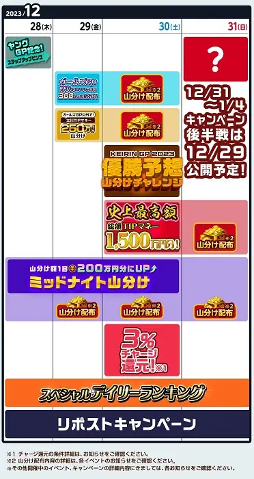 ①【12月28日(木)〜12月30日(土)】3連単的中や払戻金の積み上げでもらえる「山分けTIPマネー額1日200万円分にUP!ミッドナイト山分け」