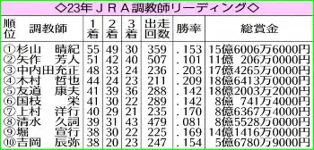 《調教師》調教師部門は55勝を挙げた杉山晴紀師(42)が開業8年目で初のリーディングを獲得した。ジャスティンパレスで阪神大賞典、天皇賞・春を連勝。デアリングタクトで制した20年秋華賞以来、約2年半ぶりのG1制覇を成し遂げた。エルトンバローズでも重賞2勝(ラジオNIKKEI賞&毎日王冠)を挙げるなど、飛躍の一年となった。昨年首位の矢作芳人師(62)は51勝で惜しくも2位。4位の木村哲也師(51)は、高勝率(・209)で総賞金18億円超え。関東を引っ張るトレーナーとして、さらなる活躍に期待が懸かる。