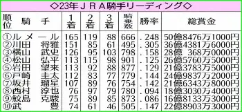 《騎手》騎手部門は165勝を挙げたクリストフ・ルメール(44)が2年ぶり6度目の頂点。イクイノックスで宝塚記念、天皇賞・秋、ジャパンCを制すなどG1・7勝。年内最後のG1ホープフルSでは、レガレイラでG1通算50勝目を達成した。総賞金は驚きの50億円超え。最多勝利&最多賞金の2冠に輝いた。2位の川田将雅(38)はJRA史上初の勝率3割超え(・305)。126勝を挙げた横山武史(25)は関東トップで総合3位に。坂井瑠星(26)は初の年間100勝を達成し、7位(107勝)に食い込んだ。