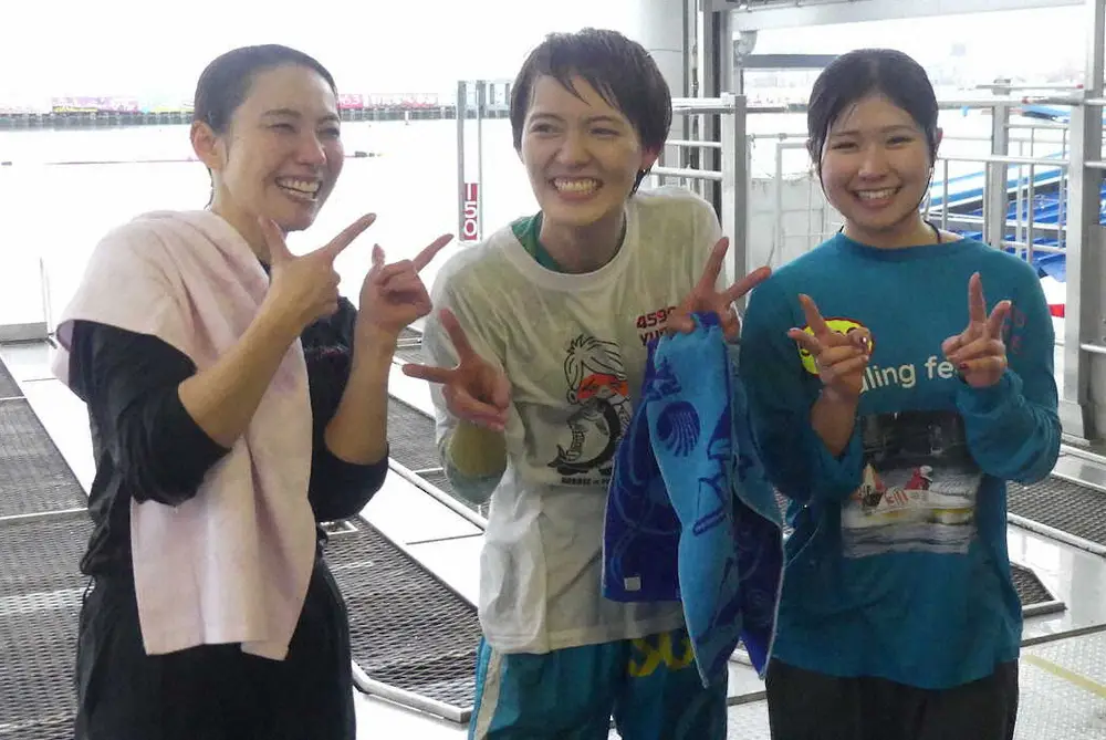 レディースオールスターで優勝した渡辺優美(中)は一緒に水面に落ちた魚谷香織(左)、弟子の神里琴音とともに笑顔を見せた