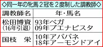 《同一年の牝馬クラシック2冠 史上最多3度目に国枝師が挑む》同一年の牝馬クラシック2冠を2度達成している調教師は国枝師と松田博資師(16年引退)の2人のみ。今回、国枝師がVなら史上最多3度目の同一年牝馬2冠制覇となる。また今回Vならクラシック6勝目で池江泰寿師、友道康夫師と並ぶ現役調教師最多勝となる。