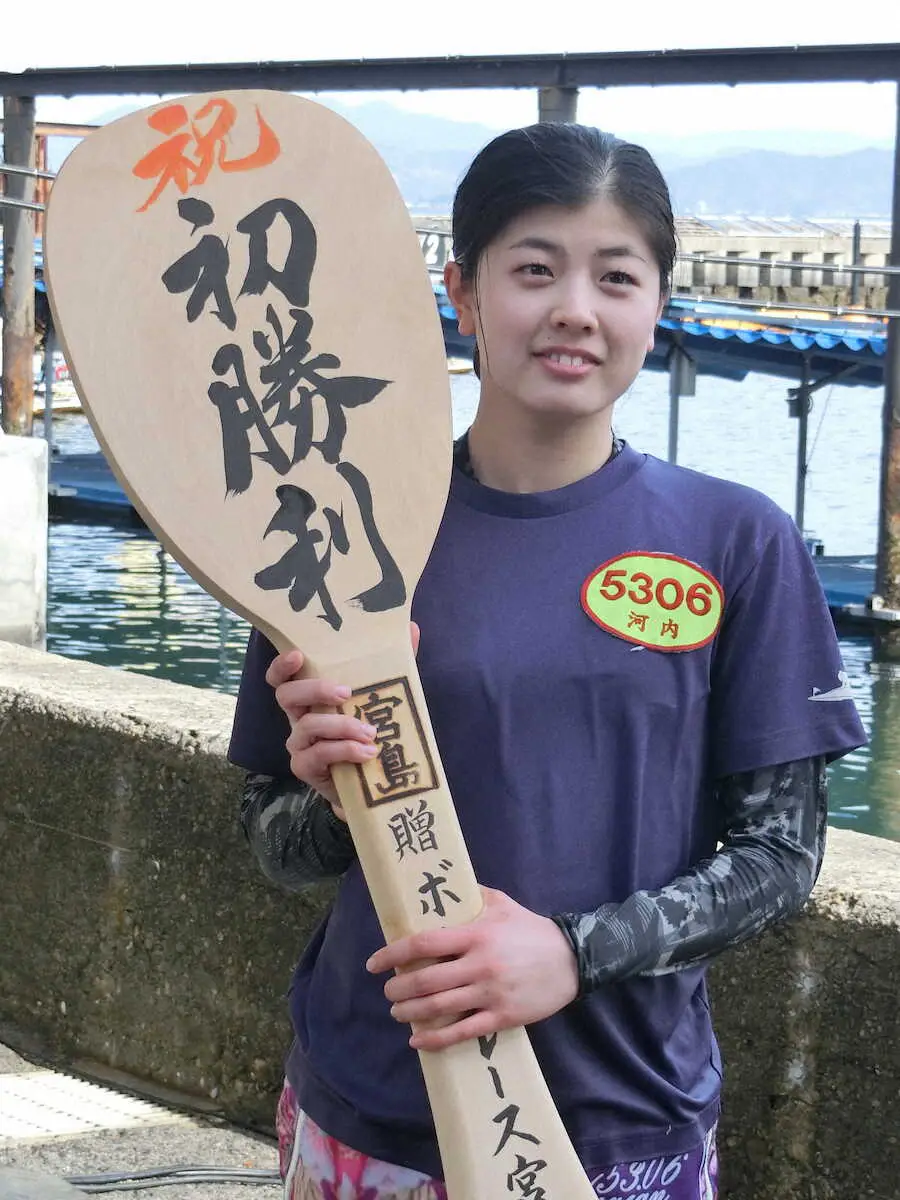 【女神にキュン】今年2月の宮島2日目10Rは、河内にとって忘れられないレースになった。冬の宮島で奇跡的にベタ水面になった一瞬、6コースから鮮やかな一撃捲り。デビュー130走目で待望の初白星を挙げた。水神祭直後には宮島名物のしゃもじを手に記念撮影。「迷わず攻めていきました。言葉にならないぐらいうれしい。1着の景色がこんないいとは思わなかったです。ホント、信じられない。もの凄く感動しています」と喜びを口にした。師匠の金児隆太も「恵まれでもなく、6コースから捲って勝つなんて素晴らしい。褒めてやりたい」と絶賛した。