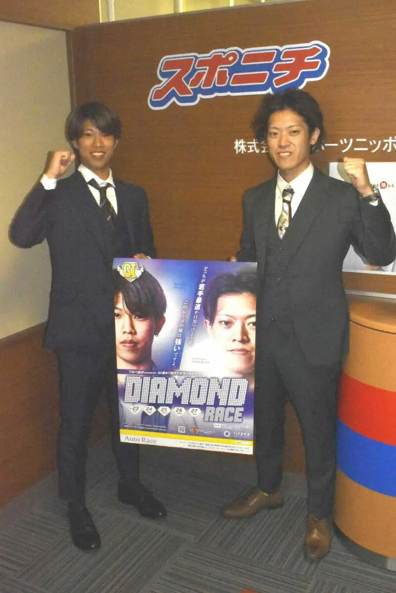 飯塚オートレース場で23日から27日まで開催される「フタバ設計presents G1第67回ダイヤモンドレース」のPR隊が21日、飯塚所属の中村杏亮(きょうすけ、28)と長田稚也(まさや、23)とともに、スポーツニッポン新聞社西部総局を訪れた。
