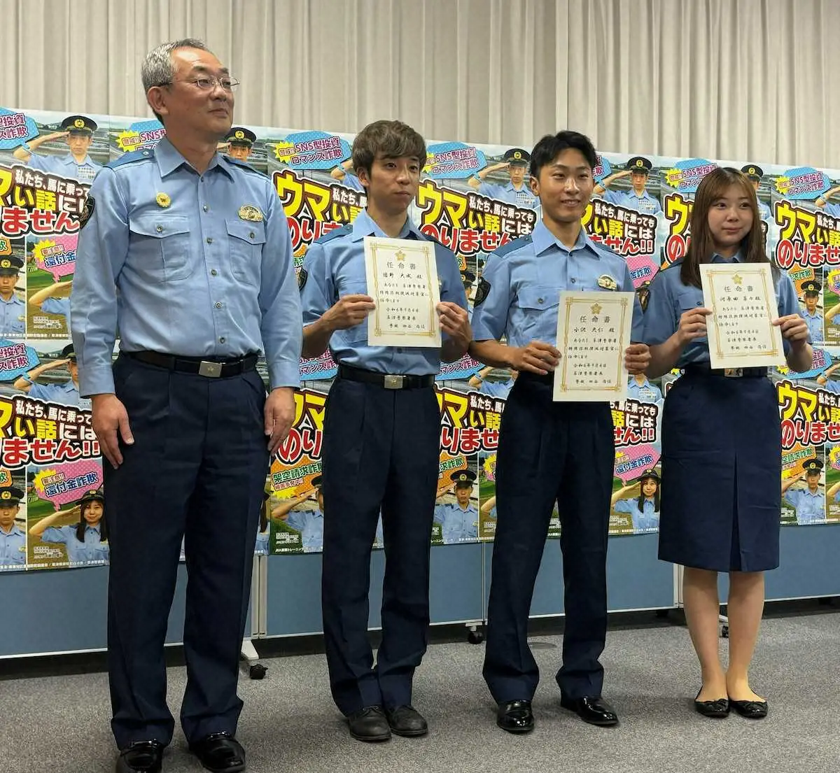 団野大成(24)、小沢大仁(21)、河原田菜々(19)が4日、滋賀県警草津警察署で特殊詐欺撲滅対策官に任命された。