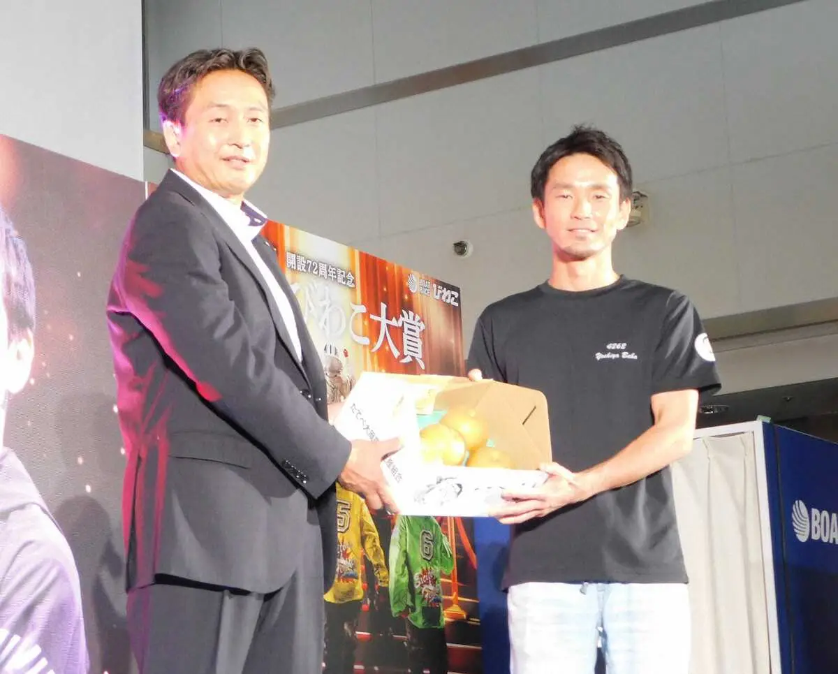 近江牛と滋賀県産の梨をプレゼントされた馬場は「3号艇になって(優勝)確率が3割くらいになったと思いました。1号艇じゃなかったのもありますけど、いつもの優勝戦より緊張しなかった」と当時を振り返り、結果的にオハコの3コース捲り差しで大会連覇の栄冠をつかんだ。