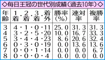 【馬齢】3歳【4・1・0・11】が最多V。全4勝は近5年でのもので、今年も信頼度は高そうだ。4歳【3・2・5・20】と、5歳【3・4・4・23】は差がないように思えるが、4歳は近5年で連対わずか1。現在5年連続で馬券に絡んでいる5歳を優先したい。7歳以上は【0・0・1・18】で消しが妥当。