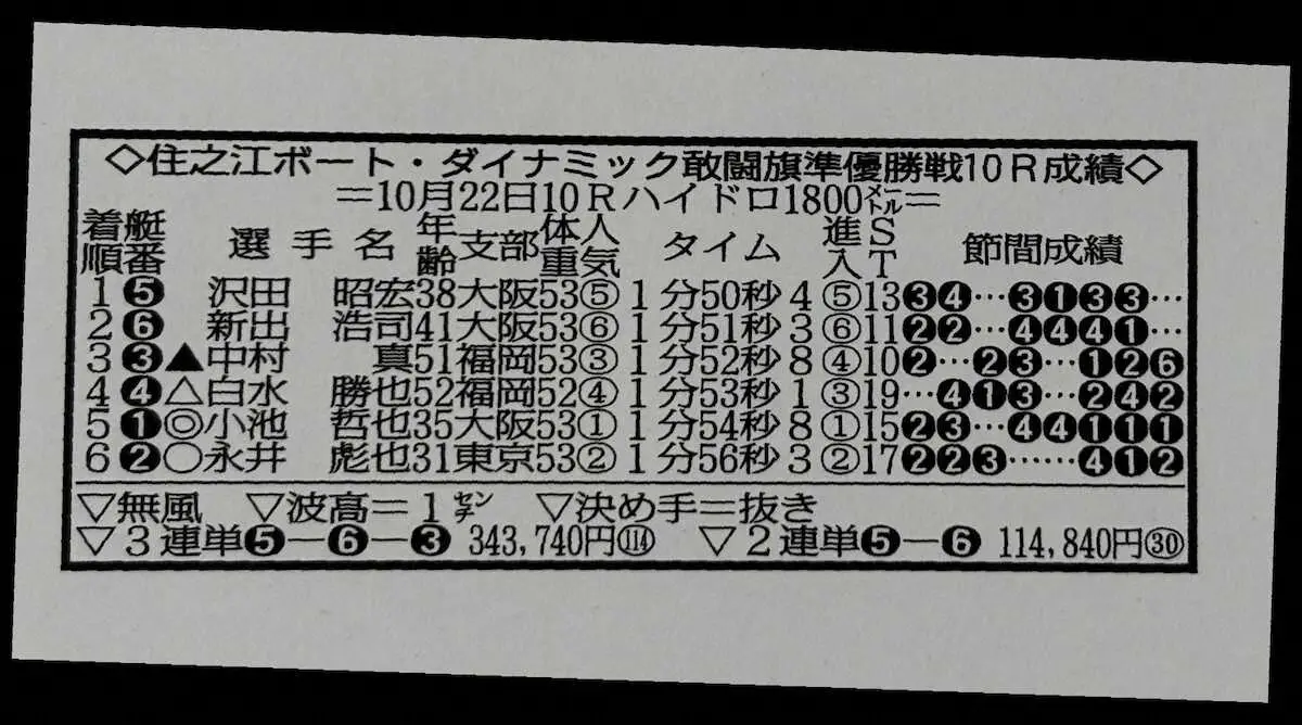 カド受け4コースから捲った中村真(51=福岡)が1周2マークで白水勝也(52=福岡)に競られて後退。6コースから1周1マークを差した6番人気の新出浩司(41=大阪)が2マークで浮上するも、カド5コースから1マークを捲り差した5番人気の沢田昭宏(38=大阪)が2マークで差して逆転。2着に新出、3着は中村が入り3連単<5><6><3>は住之江歴代高額配当で5位となる34万3740円(114番人気)。2連単<5><6>も30通り中30番人気の11万4840円という“ダブル万舟券”の波乱決着となった。