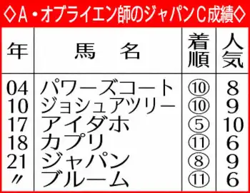 管理するオブライエン師の語気に熱がこもる。世界各地でG1・400勝以上を挙げてきた名トレーナーも日本のG1は未勝利。過去5度のジャパンC出走の際は来日しなかったが、今回はレース5日前の19日に早々と来日。自ら調教の陣頭指揮を執る。「ジャパンCは世界を見渡してもベストレースの一つ。難しいレースになると思うが勝ちたい。雄大なフットワークは東京向き。(馬も)レースに勝ちたい気持ちを持っている」。今回は間違いなく本気モードだ。