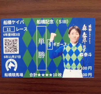 3月から始まった船橋競馬場限定、オリジナル記念馬券印刷サービスも大注目。今開催限定で森の引退を記念した特別バージョンを印刷できるのだ。早速、記者もチャレンジした。まずはキャッシュレス会員になるために身分証明書を持って「キャッシュレス受付カウンター」で会員登録。先客がいなかったので、5分ほどで手続きが完了した。受け取ったICカードでいざ森の単勝馬券を購入。場内に設置してある印刷機で無事にプリントアウトできた。あまり物欲のない記者でも思わずコレクションしたくなる一品だった。印刷には馬券購入で付与されるポイントが必要だが、1日1枚までなら無料でできる。詳細は船橋競馬場公式サイトをチェックしてほしい。