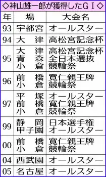 ◇神山 雄一郎(かみやま・ゆういちろう)1968年(昭43)4月7日生まれ、栃木県小山市出身の56歳。作新学院高卒。88年5月プロデビュー。通算成績は2931戦909勝、2着460回。通算獲得賞金は29億3830万円。G1優勝はオールスター5回、高松宮記念杯2回、全日本選抜1回、競輪祭4回、寛仁親王牌3回、ダービー1回。自転車競技では96年のアトランタ五輪、00年のシドニー五輪に出場。1メートル80、87キロ。血液型B。
