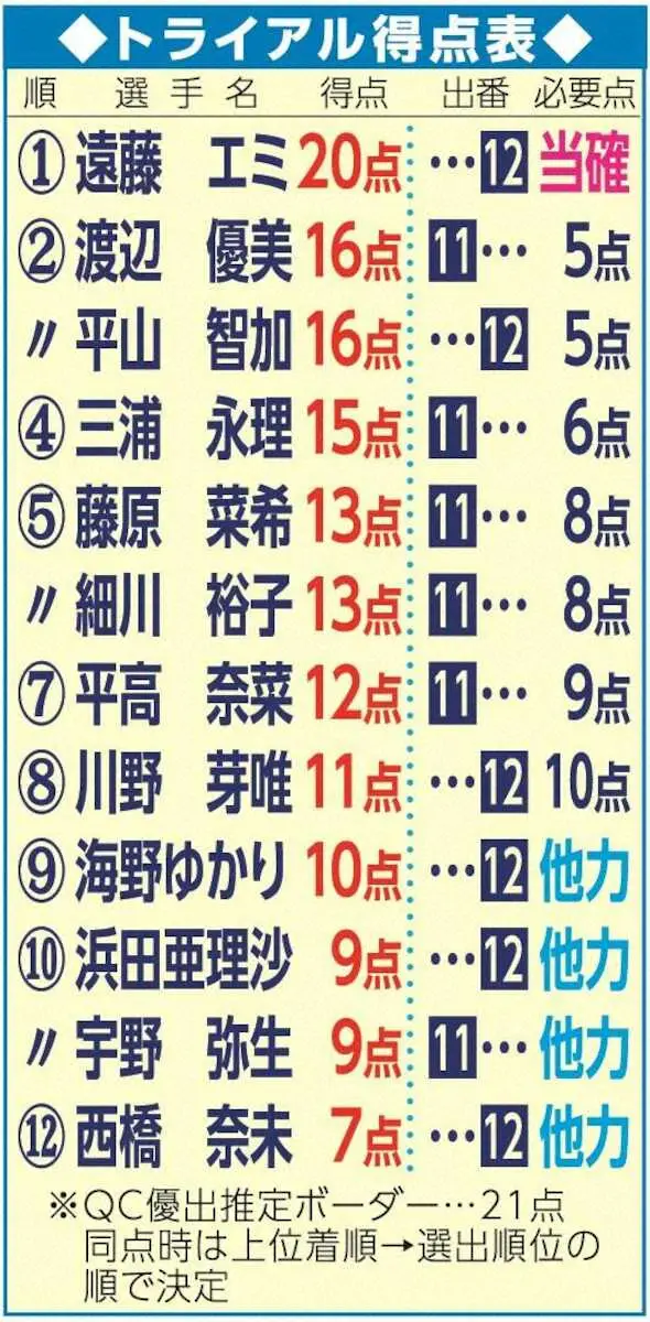 優勝戦進出ボーダーを21点に想定すると遠藤のみが安全圏。一方で海野ゆかり、浜田亜理沙、宇野弥生、西橋奈未は1着を取っても相手待ちという厳しい状況。実質、5枚のファイナル行き切符を7人で争うことになる。