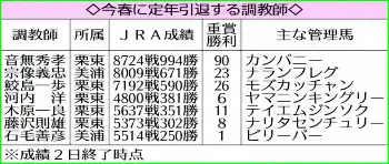 どんな時も馬優先主義を貫いた。「状態をしっかり見極める。調子が良くないと感じれば無理をさせないようにした」。トレーナーとしてラスト1カ月。今週は東京新聞杯にウォーターリヒト、きさらぎ賞にウォーターガーベラと東西重賞に管理馬を送り出す。ともに前走が重賞で馬券絡みと好内容。「2頭とも状態はいい。どんな競馬をしてくれるか楽しみ」と力を込めた。引退後は「ゆっくりお酒を飲みたい」と笑うが週末の話題になると、すぐに勝負師の表情に切り替わった。