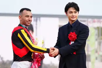 <中山11R・皐月賞>クロノデュワール(中央手前左)との接戦を制したミュージアムマイル(同右)のモレイラはガッツポーズ(撮影・村上 大輔) Photo by スポニチ 2025年04月20日の画像一覧 もっと見る 2025年04月20日の画像をもっと見る
