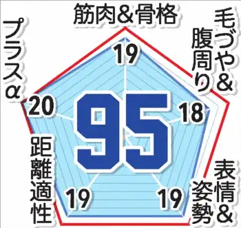 3歳馬の頂点に立つのは“ターフの翔平”だ。鈴木康弘元調教師(81)がG1出走予定馬の立ち姿を診断する「達眼」。今週はダービースペシャルとして5つのチェック項目(各20点満点)で採点、クロワデュノールとともにショウヘイを1位(95点)に評価した。達眼が捉えたのはドジャース大谷翔平ばりの筋肉パワーと穏やかな姿勢だ。
