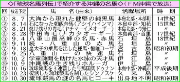 ◆琉球名馬列伝 梅崎が沖縄の名馬を紹介するミニラジオ講座。FM沖縄で8月7日~10月30日の毎週木曜(午後3時10~15分)に放送予定。県外からはラジコのエリアフリープラン(月385円、初めての方は初月無料)で聴取できる。