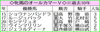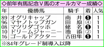 《牝馬&有馬V馬でダブルの追い風だ》オールカマーは牝馬が強く、過去10年で半数の5勝をマーク。同期間の通算【5・3・1・12】で連対率38・1%、3着内率42・9%のハイアベレージを誇る。また、前年有馬記念V馬が、翌年のオールカマーに出走したケースは、84年グレード制導入以降で別表の5例。直近では16年ゴールドアクターが優勝するなど3勝を挙げ、連対率は驚異の80%。レガレイラにとっては、いずれも追い風となる傾向だ。