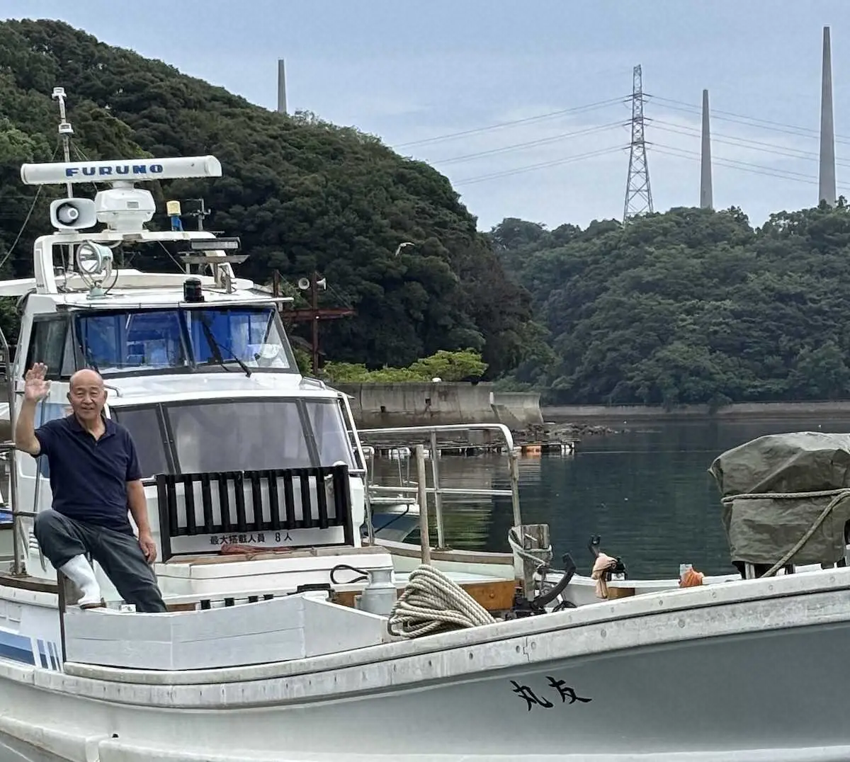 漁業活動もライフワークの一つ。有明海はもちろん、佐世保にも舟があります。友が集まる「友丸」。五島列島が漁場です。最後の写真は、愛船からさりげなく手を振ってお別れ=写真(1)。右側に映っている塔は長崎県西海橋近くにある有名な「針尾無線塔」。戦争があった時代、暗号「トラトラトラ」「ニイタカヤマノボレ一二◯八」を送信した電波塔です。御礼の意味も兼ねて27日に撮影してきました。2枚目は有明海名物ワラスボ干物(同(2)※佐賀のエイリアン!?)。オイ、占い師ではなく(笑い)、ワラスボ伝道師です。1カ月間、本当にありがとうございました。=終わり=(構成・古川 文夫)