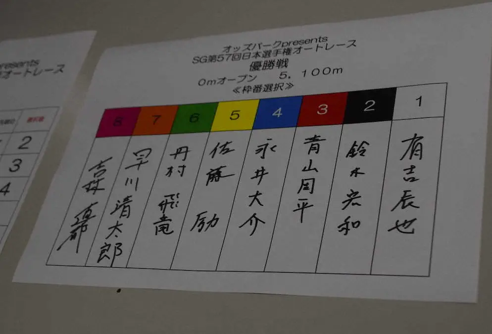飯塚オートのSG「第57回日本選手権オートレース」は5日目を終え、最終日・優勝戦の枠順が以下の通り、確定した。