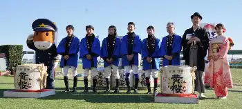 午(うま)年生まれの柴田善臣(59)、丸山元気(35)、坂口智康(35)、伊藤工真(35)、西村太一(35)が4日、中山競馬場のウイナーズサークルで行われた「新春!大鏡開き」に参加した。