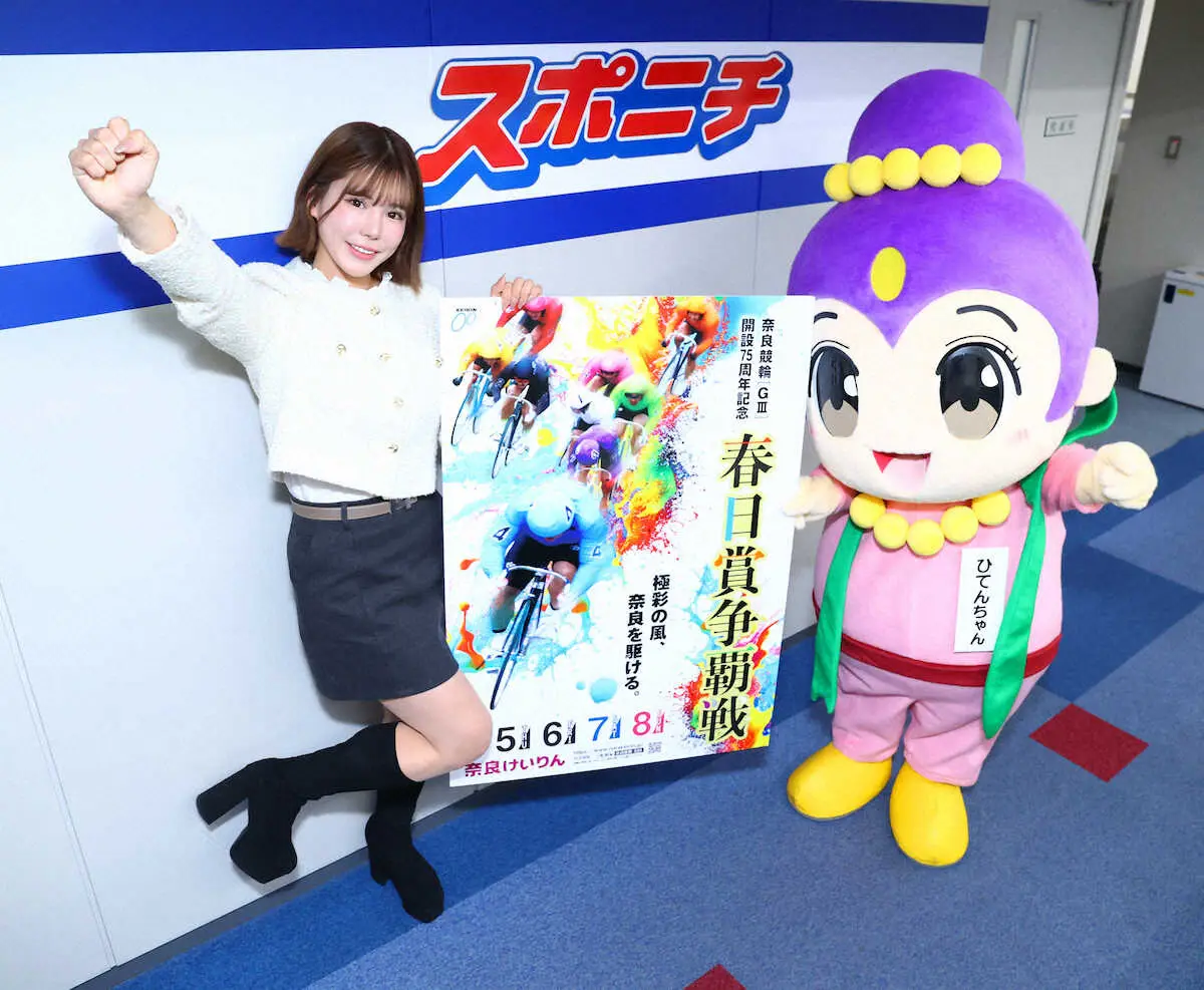 奈良競輪のPR隊が大阪市北区のスポニチ編集局を訪れ、奈良競輪場のG3「春日賞争覇戦」(2月5日~8日)をアピールした。