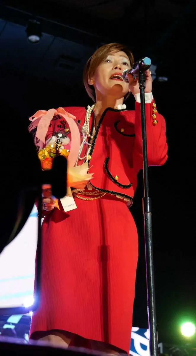 選手紹介でのコスプレで、いつもファンを盛り上げてくれる岩崎芳美(53=徳島)。今回は赤いスーツで登場して開口一番「いらっしゃいませ。スナックよしみよ~」と切り出すと「今日のおすすめは、すだち酎と球磨(くま)焼酎の繊月(せんげつ)。よしみの愛も激安で大・大・大サービスします」とセールストーク全開。