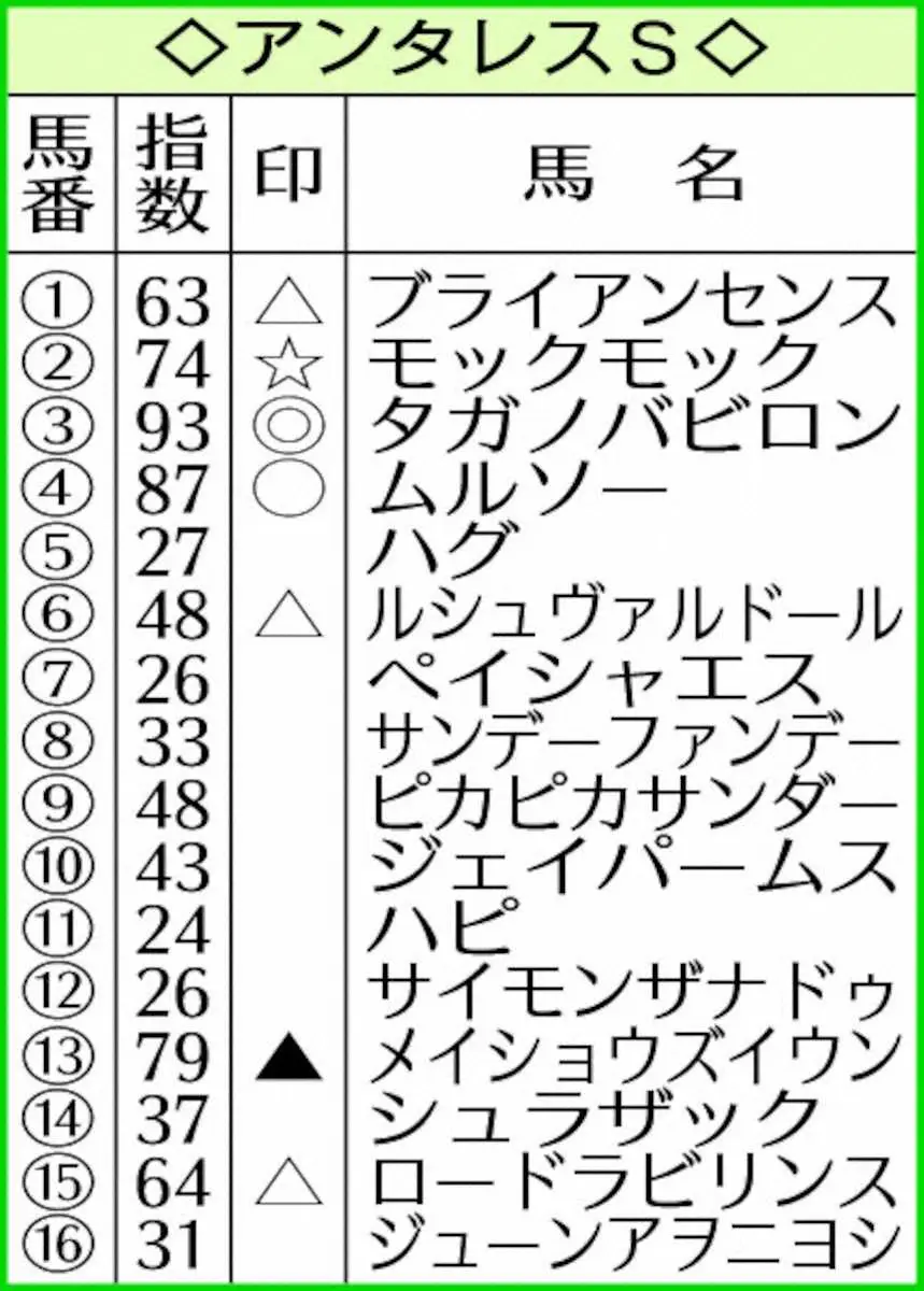 阪神メインのアンタレスSは新興勢力が目立つメンバー構成となった。その中からAIが指数93で◎に抜てきしたのはタガノバビロン。前走のレグルスSは鼻差の2着惜敗。今回再戦となる5頭には先着し、内容的にも“完勝”だった。3戦続けての当舞台参戦。2走前の重馬場1分49秒台、前走の良馬場1分51秒台の走破時計も優秀。重賞でも十分通用するレベルだ。今回が重賞初挑戦だが、メンバー中唯一の90ポイント超と素質を高く評価した。