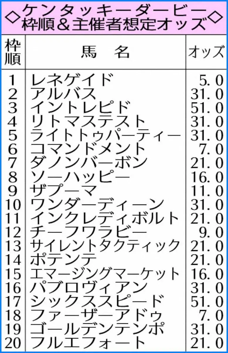 JRAが馬券を発売する米クラシック3冠初戦「第152回ケンタッキーダービー」(日本時間5月3日午前7時57分発走)は25日、出走馬&枠順が確定した。