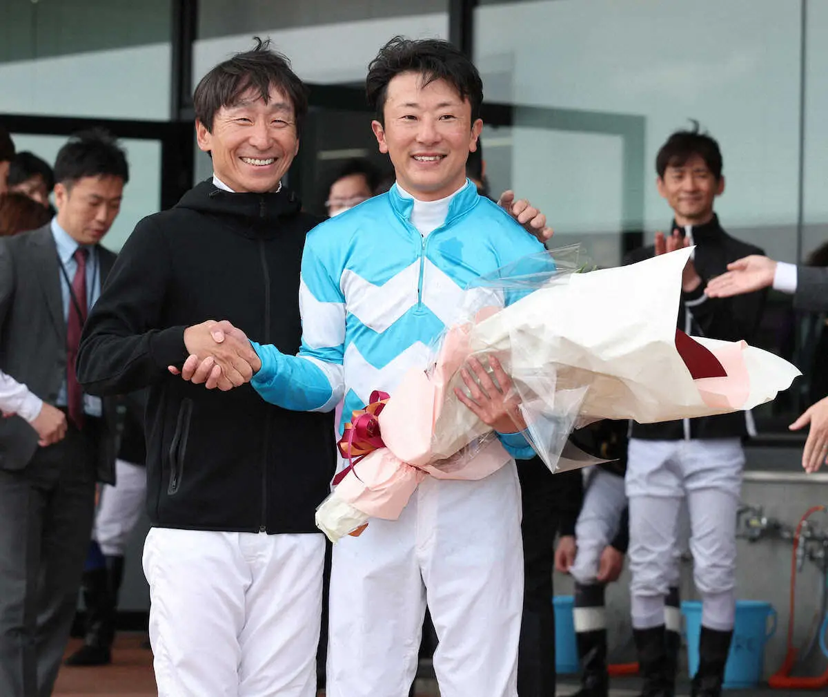 1番人気フジフォンテとのコンビで7着。「ホッとしますね。無事に帰って来られて皆に祝ってもらってありがたい」と胸をなで下ろす。レース後は横山典、武豊、元騎手で同期の川島信二助手から花束が贈られた。「典さん、豊さんに憧れてこの世界に入ったのでグッとくるものがありました。引退式の時よりいろいろ緩んで涙が出そう」と感慨深げ。晴れやかな空の下、胴上げで宙を舞った。