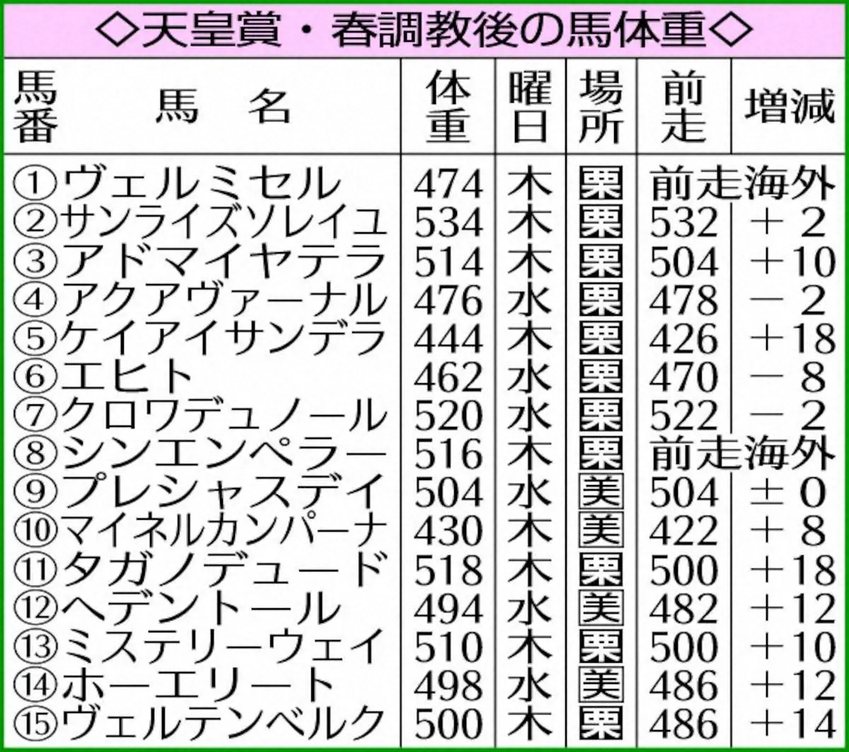 JRAは30日、天皇賞・春出走馬の調教後馬体重を発表した。クロワデュノールは2キロ減。斉藤崇師は前走について「太め感があった」と話していただけに1回使って上昇ムードが漂う。数字はそれほど変わっていなくても中身が違っていそう。