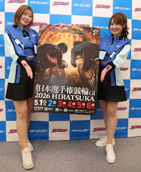 平塚競輪のPR隊とラウンドガール「湘南バンクエンジェル」の雛田唯以、桐谷流華が22日、大阪市北区のスポニチ編集局を訪れ、5月1日に開幕するG1「第80…