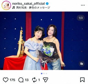 歌手で女優の酒井法子(55)が21日、自身のインスタグラムを更新。堀越高校の同級生だった西村知美(55)のデビュー40周年単独ライブへの“参戦”を報告…